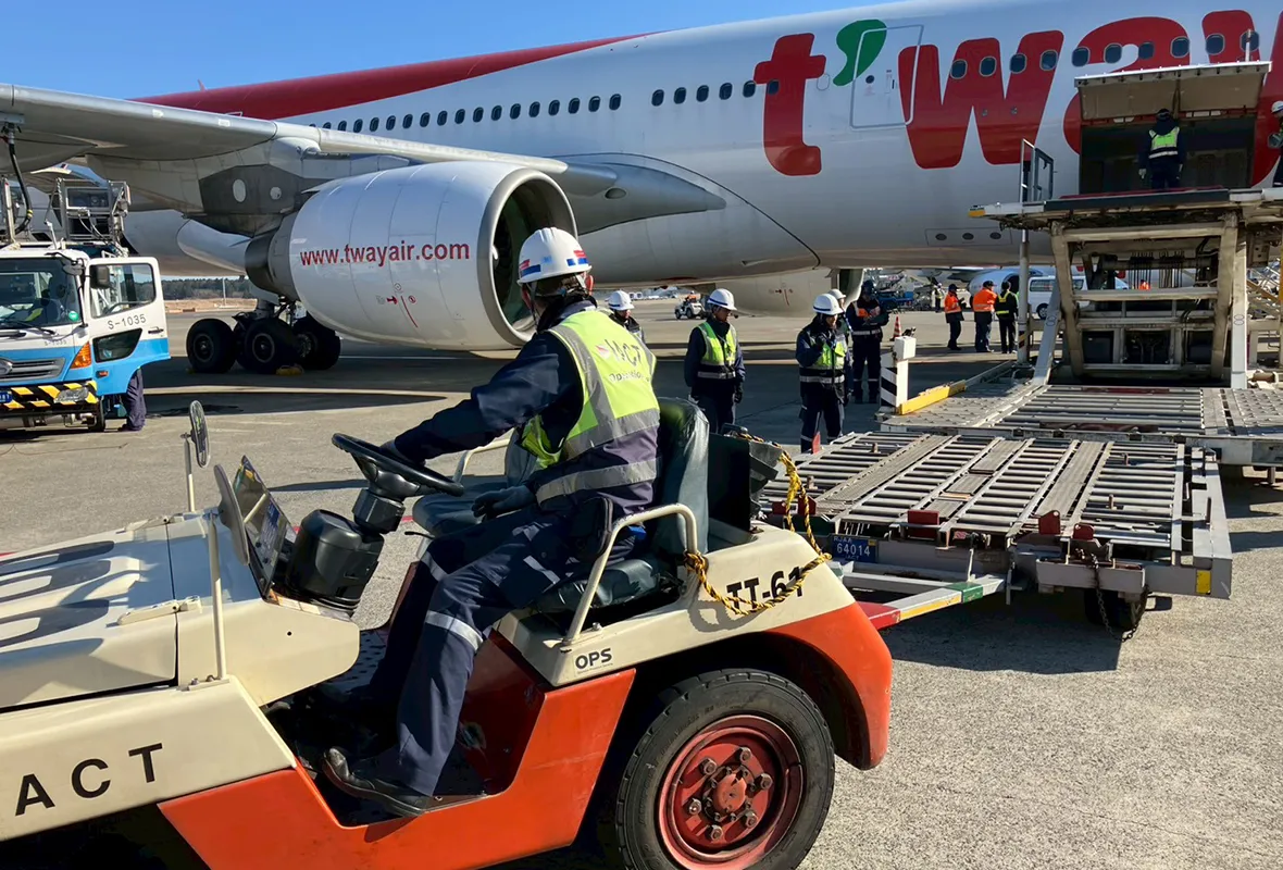 航空機へさまざまな荷物を積み降ろしする作業です。TT(トーイングトラクター)車やベルトローダー車などの専用車両を使用し、手荷物の積み込みやコンテナ移送を行います。