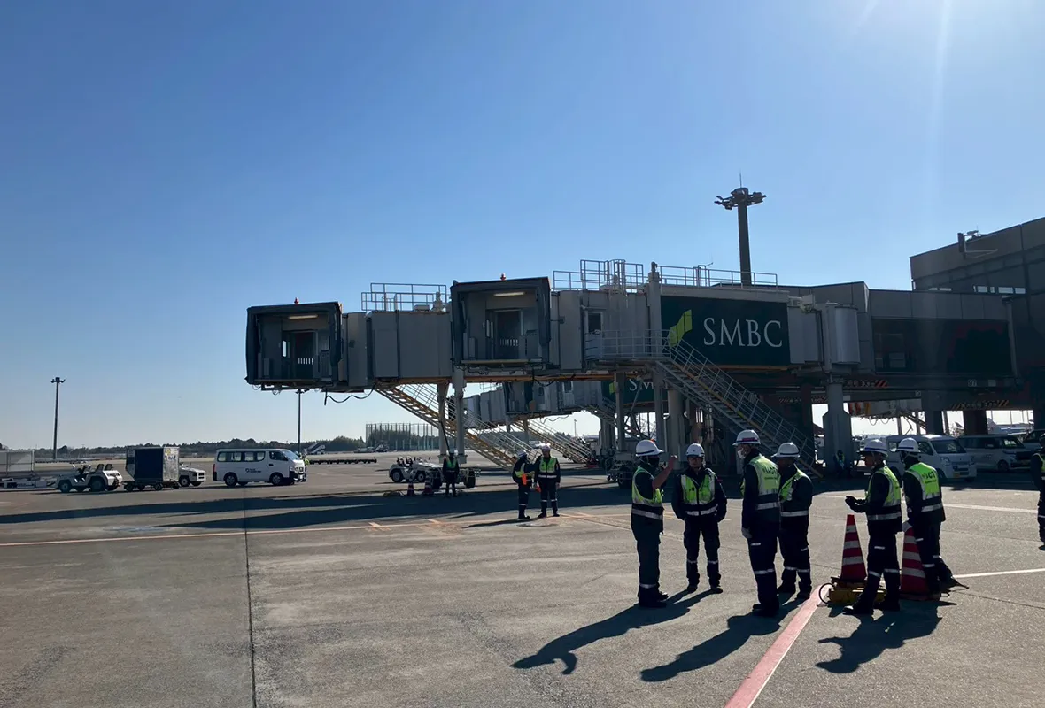 航空機の到着・出発時を支える業務です。到着時には航空機が駐機場へ安全に進入できるよう、翼の両側や機体全体を確認します。停止後は車輪止めの実施、電源供給用コンセントの取り付け、冷暖房調整用ホースの取り付けなどを行います。さらにPBB(旅客搭乗橋)の装着・離脱、航空機ドアの開閉なども担当します。出発時には航空機を自走可能な位置まで押し出す専用車両の取り付けを行い、後退時の安全確認後に車両を切り離します。国内外へ出発されるお客様のお見送りも行います。